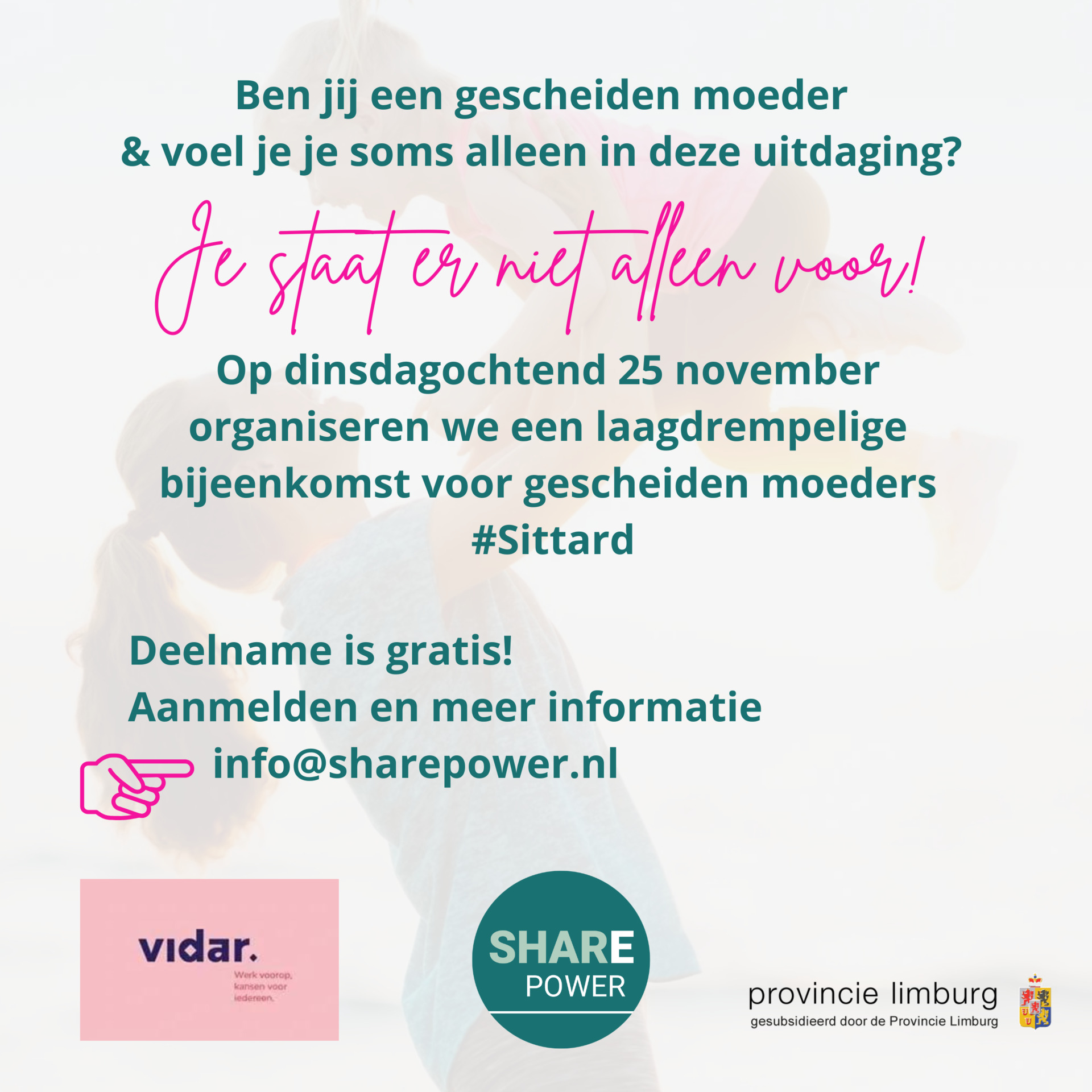 Met deze activiteit brengen we gescheiden moeders in een traject samen om hen te laten ervaren dat alleenstaand niet alleenvoelend hoeft te zijn. Vanuit kwetsbaarheid leren zij over te schakelen naar persoonlijke kracht en samenredzaamheid. Zij leren daarbij dat zij de ander (ex-partner) niet kunnen veranderen, maar alleen invloed hebben op zichzelf. Ze krijgen handvatten hoe ze vanuit een positieve blik naar de toekomst een kansrijke stevige nieuwe generatie kunnen grootbrengen.