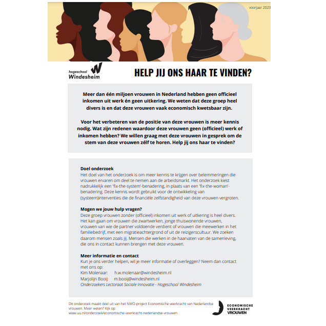 Deze kennis wordt gebruikt voor de ontwikkeling van (systeem)interventies die de financiële zelfstandigheid van deze vrouwen vergroten. Mogen we jouw hulp vragen? Deze groep vrouwen zonder (officieel) inkomen uit werk of uitkering is heel divers. Het kan gaan om vrouwen die zwartwerken, jonge thuiswonende vrouwen, vrouwen van wie de partner voldoende verdient of vrouwen die meewerken in het familiebedrijf, met een migratieachtergrond of uit de reizigerscultuur.