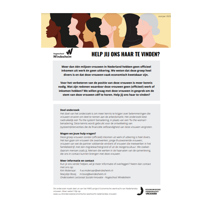 Meer dan één miljoen vrouwen in Nederland hebben geen officieel inkomen uit werk én geen uitkering. We weten dat deze groep heel divers is en dat deze vrouwen vaak economisch kwetsbaar zijn. Voor het verbeteren van de positie van deze vrouwen is meer kennis nodig. Wat zijn redenen waardoor deze vrouwen geen (officieel) werk of inkomen hebben? We willen graag met deze vrouwen in gesprek om de stem van deze vrouwen zélf te horen. Help jij ons haar te vinden?