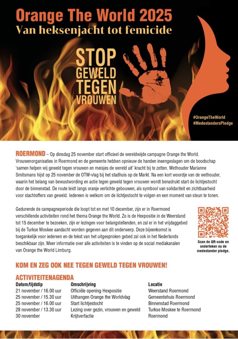 De Gemeente Roermond, ZijActief Limburg, Maximina Roermond, Roermondse Vrouwenraad, Zonta Ruremonde, Inner Wheel Nederland, Turkse Islamitische Vrouwenvereniging, Soroptimistclub Mosaïk-Limburg, Agoraclub aan de Roer, SharePower en Veilig Thuis Noord- en Midden-Limburg bundelen hun krachten om één krachtig signaal af te geven: geweld tegen vrouwen en meisjes moet stoppen!