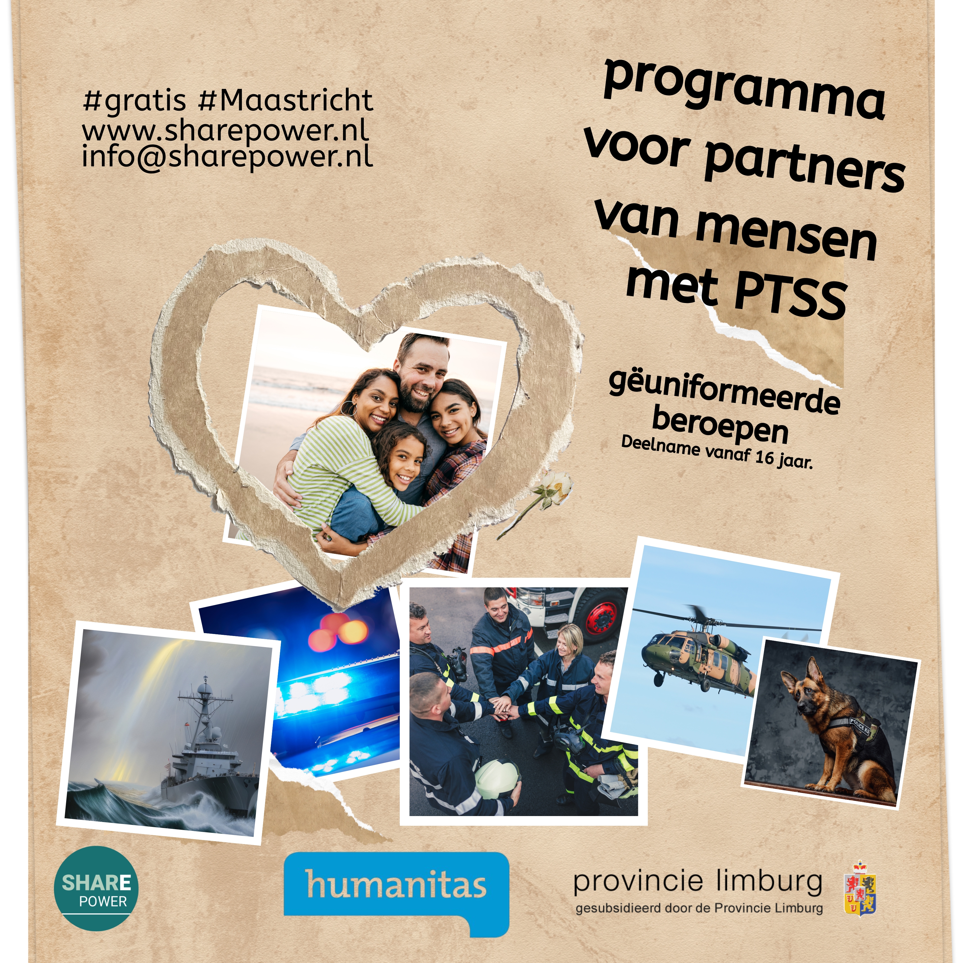 In september starten we met een nieuw gratis programma voor partners van mensen met PTSS, gericht op begrip, verwerking, zelfzorg en onderlinge steun. Het is opgebouwd rond 3 sessies van elk 3 uur. Elke sessie heeft een duidelijke structuur, met afwisseling tussen psycho-educatie, interactie en verwerking. Het programma is ontwikkeld en wordt uitgevoerd onder professionele begeleiding van GZ Psycholoog Fanny Kuijper. In een kleine en veilige setting gaan we samen aan de slag. Aantal deelnemers is beperkt en mogelijk vanaf 16 jaar.