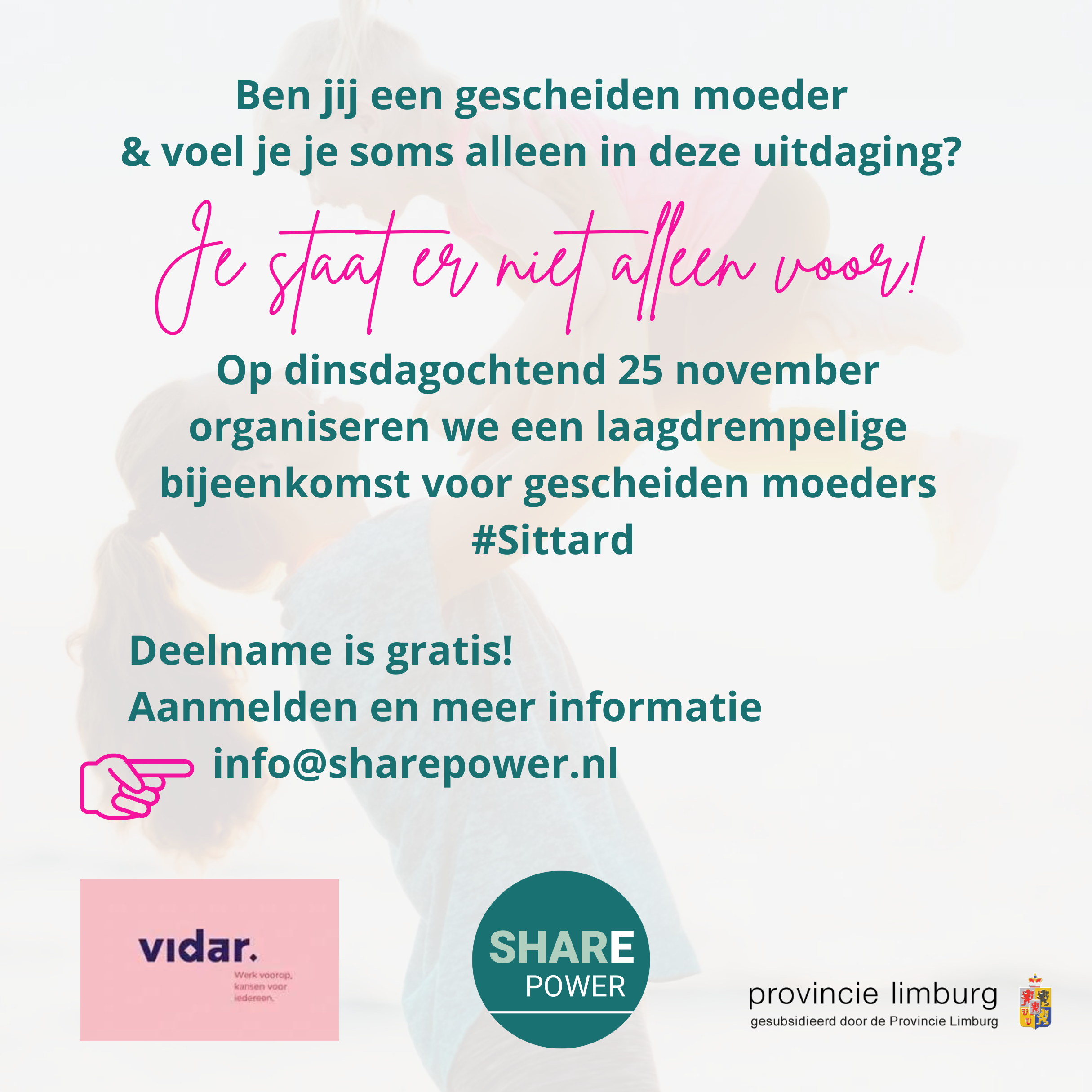 Tijdens deze gratis bijeenkomsten brengen we gescheiden moeders samen om hen te laten ervaren dat alleenstaand niet alleenvoelend hoeft te zijn. Vanuit kwetsbaarheid leren over te schakelen naar persoonlijke kracht en samenredzaamheid. Ze krijgen handvatten hoe ze vanuit een positieve blik naar de toekomst een kansrijke stevige nieuwe generatie kunnen grootbrengen.