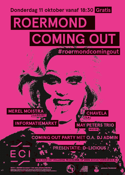 Op donderdag 11 oktober is het internationale Coming Out Dag. Oók in Roermond. Dit jaar wordt niet alleen de regenboogvlag gehesen, maar is er ook een gevarieerd programma in de ECI cultuurfabriek vanaf 18.30 uur. Met cabaret, film, muziek een informatiemarkt en een feest. Een initiatief van de gemeente Roermond, COC Limburg en de ECI cultuurfabriek.