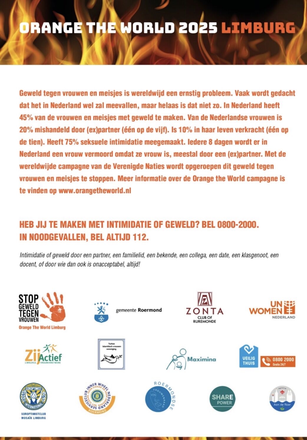 De Gemeente Roermond, ZijActief Limburg, Maximina Roermond, Roermondse Vrouwenraad, Zonta Ruremonde, Inner Wheel Nederland, Turkse Islamitische Vrouwenvereniging, Soroptimistclub Mosaïk-Limburg, Agoraclub aan de Roer, SharePower en Veilig Thuis Noord- en Midden-Limburg bundelen hun krachten om één krachtig signaal af te geven: geweld tegen vrouwen en meisjes moet stoppen!