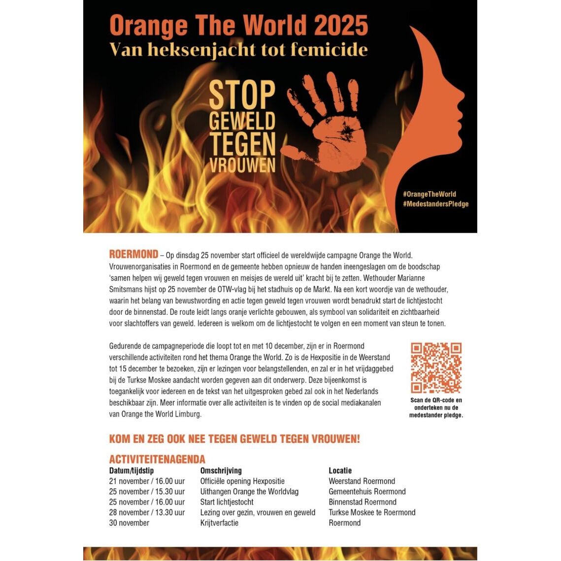 Wethouder en Topvrouw Limburg 2025, Marianne Smitsmans hijst die dag de oranje Orange the World-vlag bij het stadhuis op de Markt. Na een kort woord over het belang van bewustwording en actie start de lichtjestocht door de binnenstad. Langs oranje verlichte gebouwen lopen inwoners en organisaties zij aan zij, als symbool van hoop, solidariteit en zichtbaarheid voor slachtoffers van geweld. Iedereen is van harte welkom om mee te lopen en een lichtje van steun te laten branden.