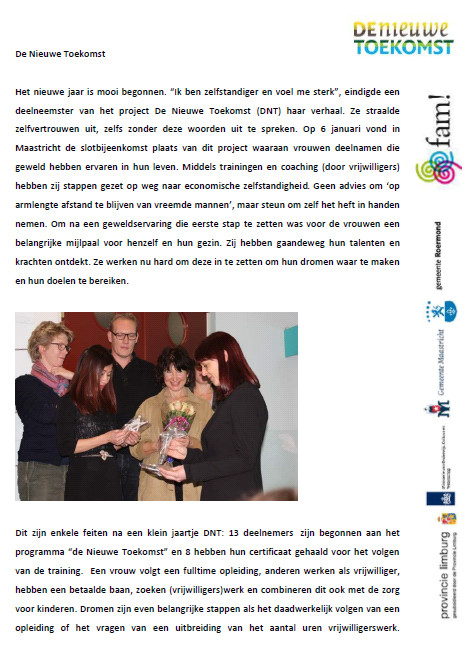 Het nieuwe jaar is mooi begonnen. “Ik ben zelfstandiger en voel me sterk”, eindigde een deelneemster van het project De Nieuwe Toekomst (DNT) haar verhaal. Ze straalde zelfvertrouwen uit, zelfs zonder deze woorden uit te spreken. Klik hier voor het verhaal.